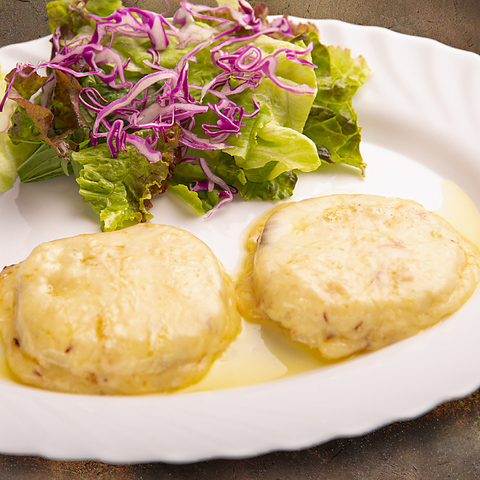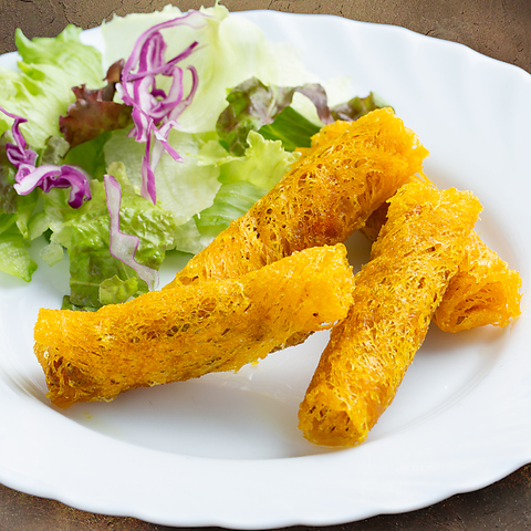 シャキシャキの蓮根にクミンを効かせ、スパイスとチーズを合わせて香ばしく焼き上げました。オリーブオイルの風味とともに、チーズのコクとスパイスの香りが食欲をそそる一品です。