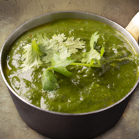 たっぷりの国産ほうれん草をじっくり煮込み、自家挽きスパイスで香り高く仕上げた一皿。自家製カッテージチーズ(パニール)がやさしいコクを添え、素材の旨みを際立たせます。