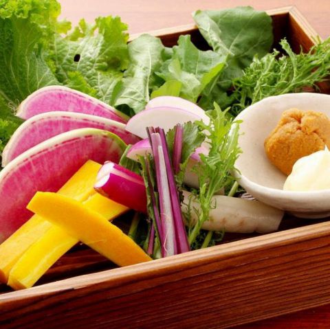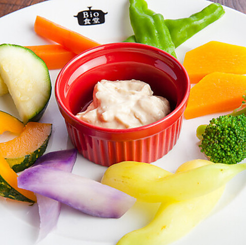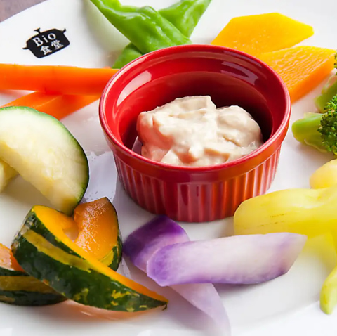 2人前:1078円(税込)/それぞれの野菜の個性が楽しめるサラダ。有機麹を発酵、調味料を加えて熟成させて作った自家製辛味もろみがアクセント。動物性不使用の特製豆乳バーニャソースをお野菜に付けてお召し上がりください。