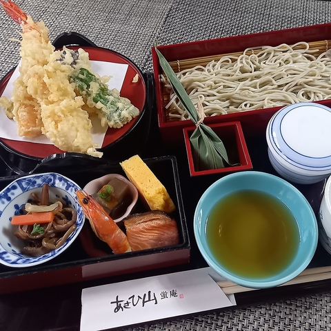 蔵元「朝日酒造」の酒蔵のある里で地場産打ち立てそばとお料理をお楽しみください。海老と旬野菜天ぷら盛合せ・笹かすたーど・茶碗蒸し・せいろそば・季節の味わい箱(鮭味噌漬焼き・玉子焼き・季節の小鉢二点・海老旨煮)