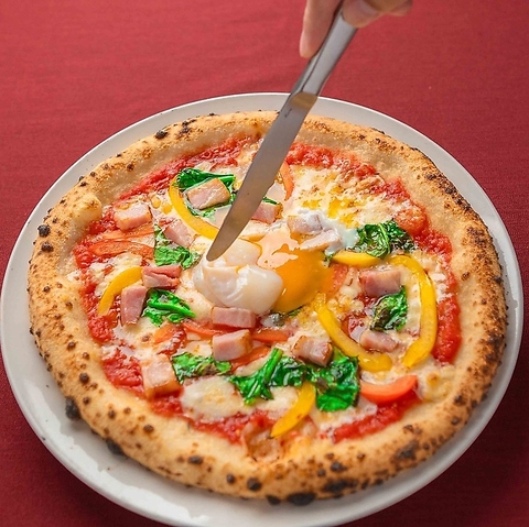 Pizzaは、店内の石窯で専門スタッフが1枚1枚丁寧に焼く本格ナポリピッツァ。もちもちの生地にとろけるチーズは、ワインとの相性◎王道のマルゲリータから、ゴルゴンゾーラなど4種類のチーズと蜂蜜のマリアージュがたまらないクアトロフォルマッジ、半熟卵がとろけるビスマルクなど全10種以上!いくつか注文しシェアいただくのがオススメです♪