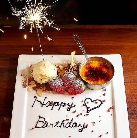 誕生日や記念日、大切な方のお祝いに、メッセージ付の記念日デザートをご用意しております。お食事の後は、主役の方へのサプライズにいかがでしょうか。※写真はイメージです ※17:00~提供可能です※ご希望のメッセージをお知らせください→15字まで可能♪※記念撮影もOK!→お客様のケータイをお借りして撮影可能