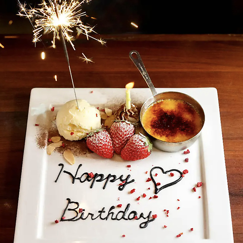 誕生日や記念日、大切な方のお祝いに、メッセージ付の記念日デザートをご用意しております。お食事の後は、主役の方へのサプライズにいかがでしょうか。※写真はイメージです ※17:00~提供可能です※ご希望のメッセージをお知らせください→15字まで可能♪※記念撮影もOK!→お客様のケータイをお借りして撮影可能