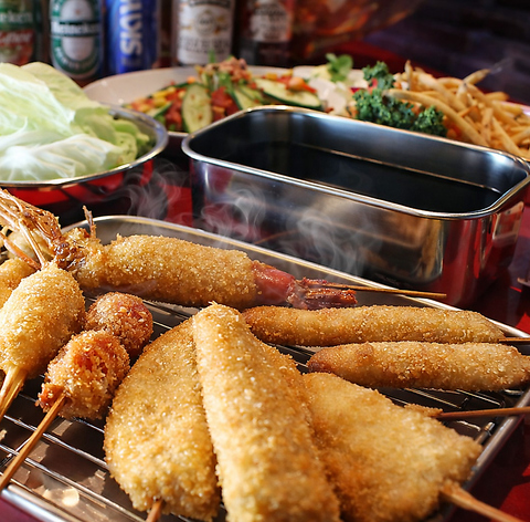 ネタは大きく、衣はサクっと優しく包み込むように、揚げたての串かつは絶品大好!!大阪本場の味を楽しんでいただけます♪秘伝のタレは創業以来継ぎ足されてきた完全オリジナル☆串カツ8種・枝豆・キムチ・かりかりポテト・サラダ・飲み放題がついて4500円!!