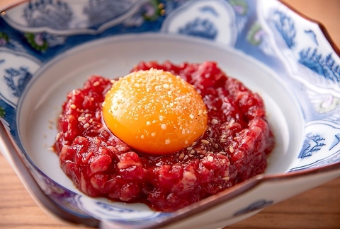 厳選赤身のユッケは特性ダレと卵黄でどうぞ。