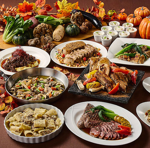 前菜をはじめ、種類豊富なサラダバーや魚・肉料理の他、パスタやカレーなど食べ放題のランチブッフェです♪バリエーション豊かなシェフ特製デザートも大好評◎さらに豪華になった「ステーキ」等のメイン料理は、追加料金でグレードUPも可能です。土日祝日は追加メニューも登場!大満足のブッフェを心ゆくまでお楽しみください!※食材の関係でメニューが変更になる場合がございます。