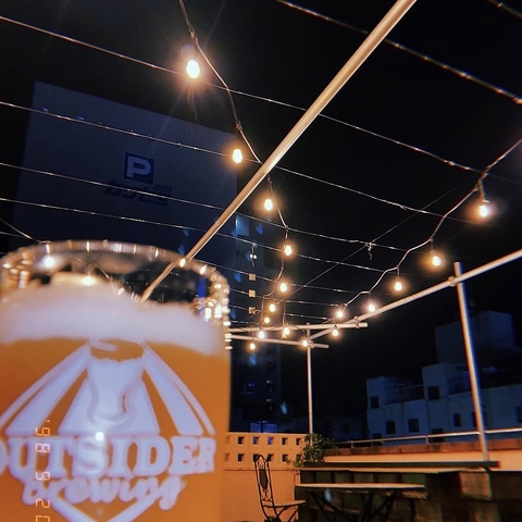 街の中に突如として現れる1階ビール工場『アウトサイダーブルーイング-Outsider Brewing』工場はガラス張りになっているので朝、仕込みの様子が見れることもあります!その脇右側より、2階への階段がありますので夕方、是非ぶらっとお立ち寄りください。