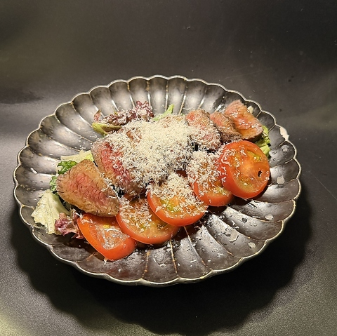 牛一頭からわずか数キロしか取れない希少部位シンタマを低温調理後、炭火で燻した「牛のタタキの炭火焼タリアータ」!シンタマは希少部位なので、あまり馴染みのない名前かもしれませんが牛の内モモの下部にある丸い赤身肉のかたまりで通常のモモ肉とは異なる旨味を感じていただけます!