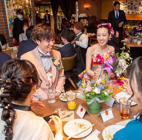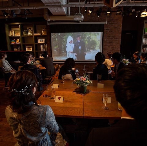 木のテーブルにレンガ調の壁が落ち着く空間となっています◎広々としたは、結婚式の1.5次会や二次会・イベント等でもご利用いただけます◎大人数様は、貸切でご利用いただけます!ムービー上映やコンテンツなどでも利用できる大きなプロジェクターや、司会に便利なマイク等設備も充実しており無料で貸出★詳細は店舗へお問い合わせください♪
