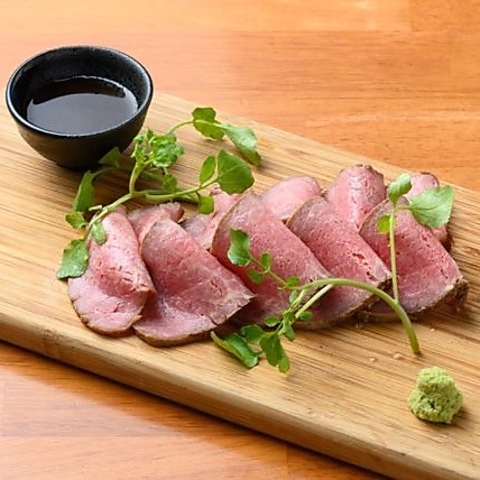 大人気の自家製ローストビーフ! じっくり丁寧に火入れしたから口の中でとろける柔らかさとジューシーなビーフ。トリュフシャリアピンソースとご一緒にお召し上がり下さい♪【ハーフ】649円 【ふつう】1,089円