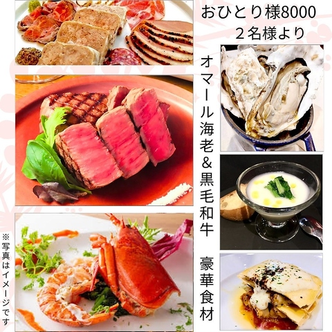 リーズナブルな女子会3000円コースから、ワイン11種類が飲み放題に付いた4400円コースや季節の食材を使用した4980円コース、オマール海老や黒毛和牛の赤身&霜降り肉がメインの豪華6500コースなどございます。またご予算に応じてご準備いたしますので、お気軽にお問い合わせください。