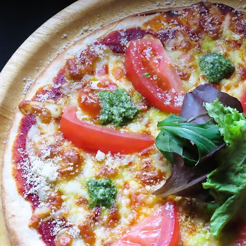 ふんわりと焼き上げられた生地に、たっぷりトッピング!ピザは4種類をご用意!生ハムのサラダピザは、コースでもお楽しみいただけます★マルゲリータはシンプルだけど味わい深いおいしさが自慢です!甘じょっぱいハニーチーズは、デザート感覚で楽しめます♪ジェノベーゼは、食欲をそそるバジルの風味が豊かな香りが特徴◎
