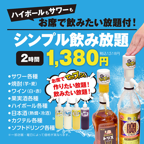 2時間飲み放題1518円!さらにお席で飲みたい放題"てけプッシュ"なら、1時間たったの879円!
