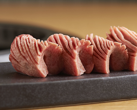 生産者の想いも届けたいと、オーナー自らが生産農家に足を運び、信頼関係を築き上げて上質な牛肉を提供。ロースやカルビなどの赤身肉は、すべてA5ランクの仙台牛を使用している。冷凍保存はせず、オーダーを受けてから切り分ける。やわらかな肉質を壊さないように、繊維やサシの入り方を入念に見極めてカットしている。