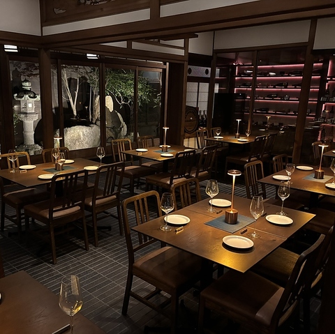 古民家ならではの中庭が四季を感じさせてくれて情緒があります。和と洋の雰囲気が入り混じる独自の雰囲気を楽しみながらお食事やお酒をお愉しみください。