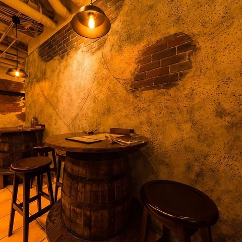 【樽テーブル席:3名様卓x2】お洒落な樽テーブル席で地中海料理を。本場のバルを彷彿とさせるお洒落な樽テーブル席。~3名様の樽テーブルが2卓あるので、デートはもちろん、テーブルを繋げてお友達同士の宴会などにも最適です。粋な雰囲気を満喫しながら自慢のピッツァと美味しいワインを楽しんでみては。