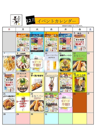 12月もイベント企画が盛り沢山!!日替わりでイベントカレンダーを実施中です♪また、平日限定での女子会プラン、その他の企画も実地しています。詳しくは、お問い合わせください。