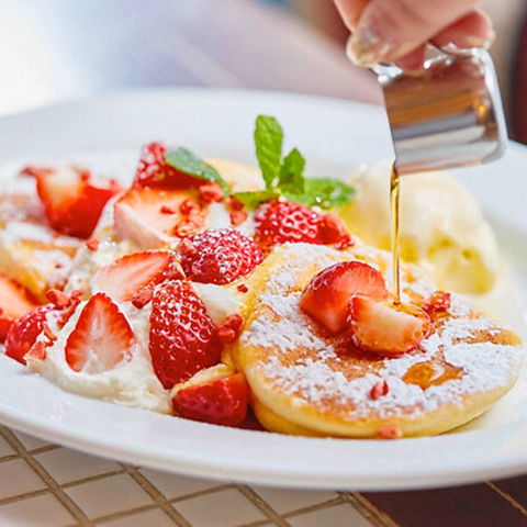 オリジナルパンケーキは14時から18時までご利用いただけます。ふわふわの食感と豊かな風味が自慢の一品。厳選した素材を使用し、丁寧に焼き上げたパンケーキは、シロップやフルーツとの相性抜群!デザートにぴったりな贅沢なひとときをお楽しみください。