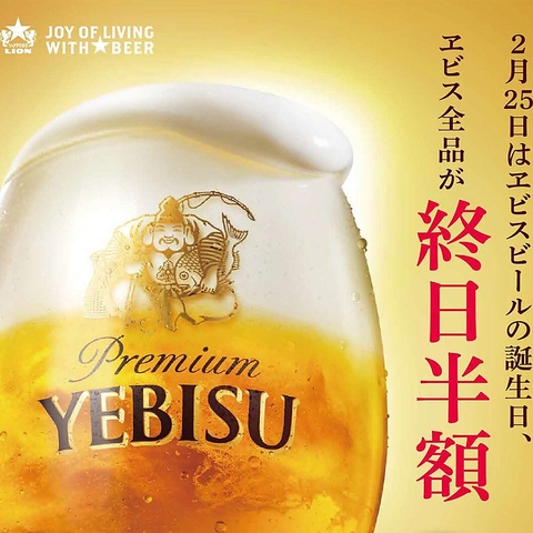 2月25日はヱビスの日!終日エビスビール全品半額!最高の一杯を追求したこだわりのヱビスを、心ゆくまでお楽しみください。お一人様も、大切な方との乾杯も大歓迎!皆様のご来店をお待ちしております。