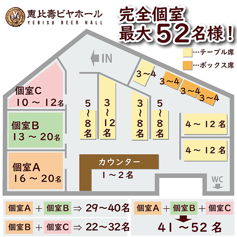 【個室A+B+C】最大52名様までの完全個室。恵比寿で誇る大型個室を完備!個室のご利用は10名様~最大52名様まで。