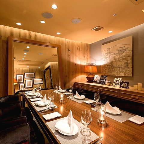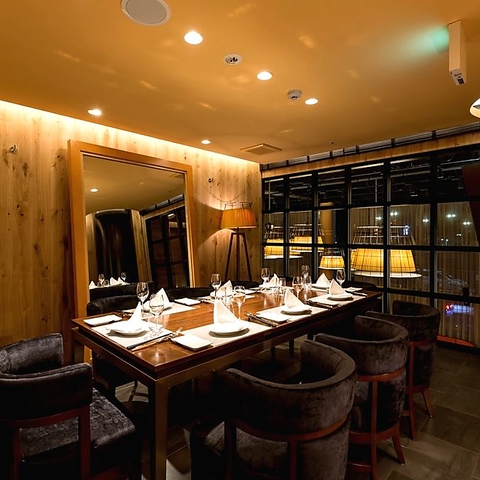 入ってすぐカウンターがあり『シャンパンの泡』を連想させる照明がお出迎え。そこにいるだけでワクワクするような素敵空間でお過ごし頂けます。レストランの2階にある個室は、最大8名様まで可能な特別空間。