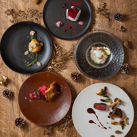 九州各地の厳選食材を使用した、クリスマス期間限定のフルコースをご用意しました。九州鮮魚のカルパッチョや甘鯛のポワレ、旬の野菜を取り入れた前菜などに加え、メインは「梶屋牛」と「延岡鹿肉」を炭火で香ばしく焼き上げた豪華なひと皿。仕上げには「白い雪と赤の贈り物」と題したパティシエ特製のクリスマスデザート。