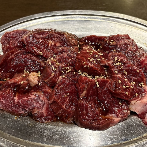 まずはこれから!焼肉の定番・牛タンは、鮮度と厚みにこだわりました。独特のプリッとした歯ごたえと、噛むほどに溢れ出すジューシーな肉汁がたまりません。レモンを軽く絞り、さっぱりとお召し上がりいただくのが王道。程よくのった脂の甘みが口いっぱいに広がります。宴会のスタートを彩る、当店自慢の看板メニューです。