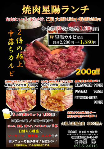 【10名様限定で1200円(税込)に!!】コスパ抜群の焼肉定食は、ランチでも焼肉を焼きながらお召し上がり頂けます☆お皿から溢れそうな柔らか中落ちカルビを、お昼から贅沢に食べられるのは星陽だけです!他店舗では通常80グラムの提供ですが、星陽なら200グラム提供致します!!通常焼肉定食5,6枚が、何と10枚以上!!お得に食べれるランチです!