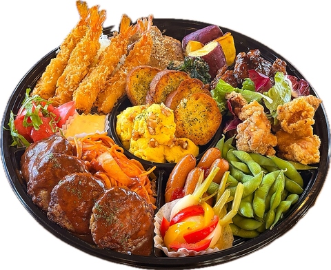 販売期間:2025/12/1~12/31【※2日前までにお電話にてご予約ください】3人前5000円、4人前6600円、5人前8200円。内容:ナポバーグ/エビフライ/唐揚げ(プレーンと黒酢)/ポークソテー胡麻マスタード/ソーセージ/生ハムとチェダーチーズのポテサラ/えびとブロッコリーのマリネ/ピクルス