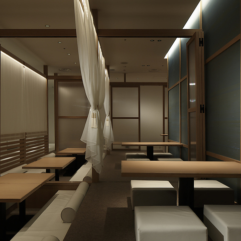一流デザイナーが手掛けたスタイリッシュな店内★間接照明で落ち着いた雰囲気!!どちらのお席に座ってもゆったりとお寛ぎ頂けます !4名様前後のお席や、最大60名様のエリア貸し切りなど充実♪団体様のご予約はお気軽にお電話ください!