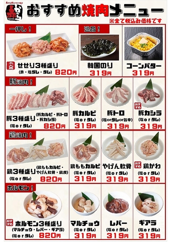 大人気せせりの盛り合せや、韓国のりやコーンバター、さらに鶏、豚、ホルモンの単品とお得な盛り合せもご用意!いろんな焼肉をお楽しみください!