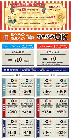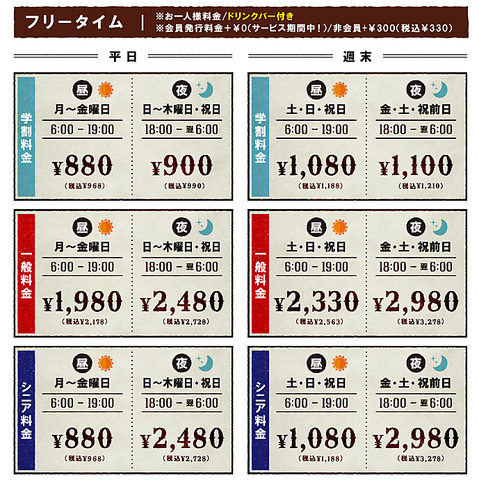 ★フリータイム料金★お一人様料金/ワンドリンクオーダー制/会員発行料金0円(サービス期間中!)/非会員税込+\330※料金表は全て会員料金です。