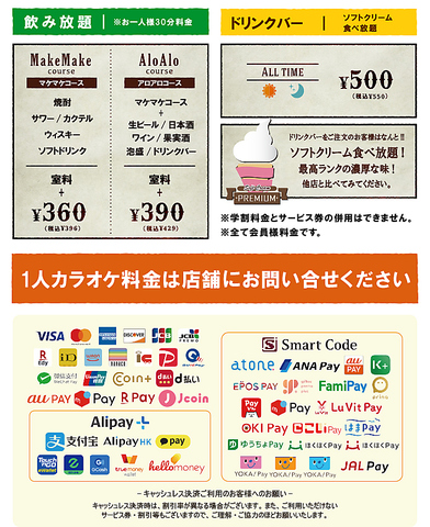 ★飲み放題・ドリンクバー料金★お一人様30分料金/会員発行料金0円(サービス期間中!)※料金表は全て会員料金です。