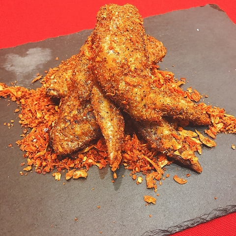 下味しっかりの手羽先を油でカリッと揚げ♪華や特製の自家製スパイス【魔法の粉】をたっぷりかければ、辛さの中にも旨さあり、病みつきになること間違いなしの逸品です♪