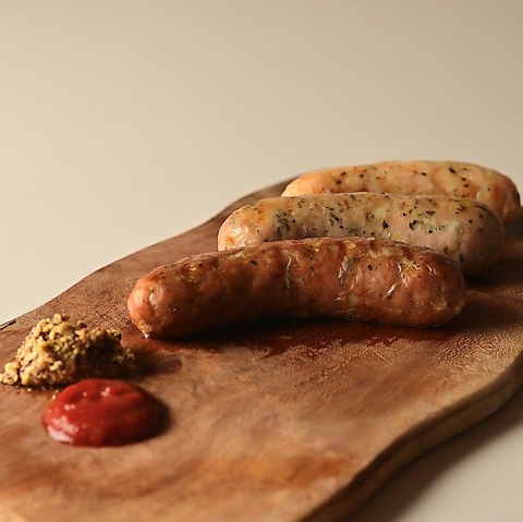 当店看板!自家製ソーセージは、ポーク、チキン、エビの3種類をご用意。新鮮な素材を使用し、スパイスの香りが食欲をそそります。ジューシーな肉汁が口いっぱいに広がり、ビールとの相性も抜群!一度食べれば、その美味しさにリピート間違いなし。まずは「自家製ソーセージ3本セット/1300円(税込)」からいかがでしょうか?