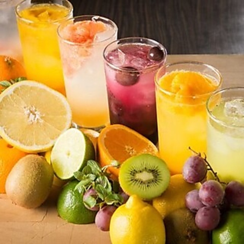 | サワー | グレープフルーツ/ライム/ゆずみつ/梅/ピーチ/巨峰/青りんご/ライチ/マンゴー/トマト/柚子/シークゥワーサー/カルピス/酎ハイ/ウーロンハイ/緑茶ハイ/ジャスミンハイ |