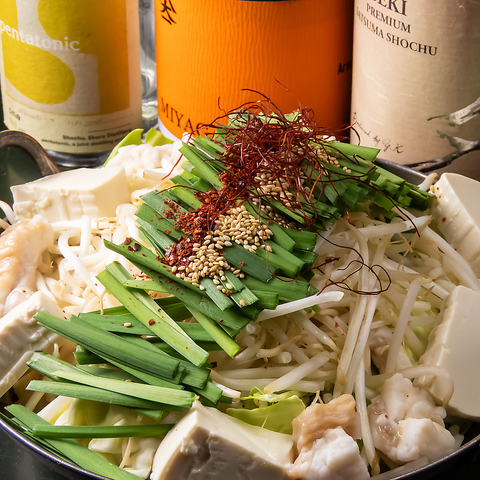 【赤】ピり辛、【白】甘口、【桃】中辛、【塩】の4種から選べるもつ鍋は大好評♪牛もつ鍋がおいしいのは店長が鶏がらを6時間じっくりたいて、丁寧にお出しを取っているから。しっかりお出汁をとったスープに厳選お味噌で味つけ。ホルモンは国産和牛を使用。店長の愛情たっぷりの牛もつ鍋をご賞味あれ♪(食べ方は設備欄をご覧ください。)