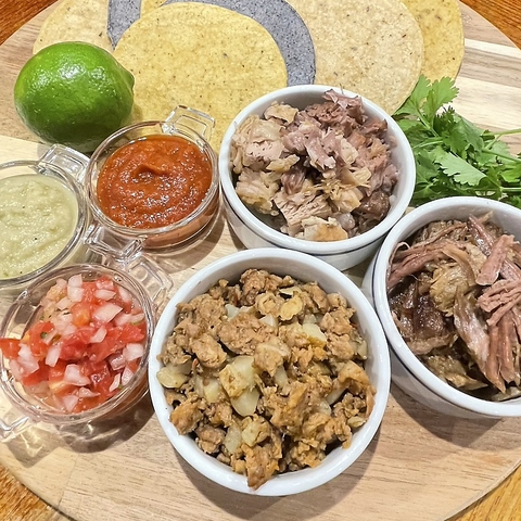 メキシコ在来種100%トウモロコシトルティーヤとタコスの具材のお肉、サルサ、トッピングで楽しんでいただくタコスホームパーティーのセットです。