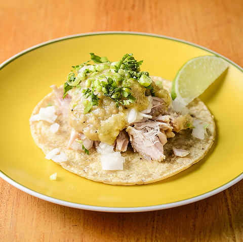豚の煮込み、サルサベルデ、玉ねぎ、パクチー、ホワイトコーントルティーアのセット