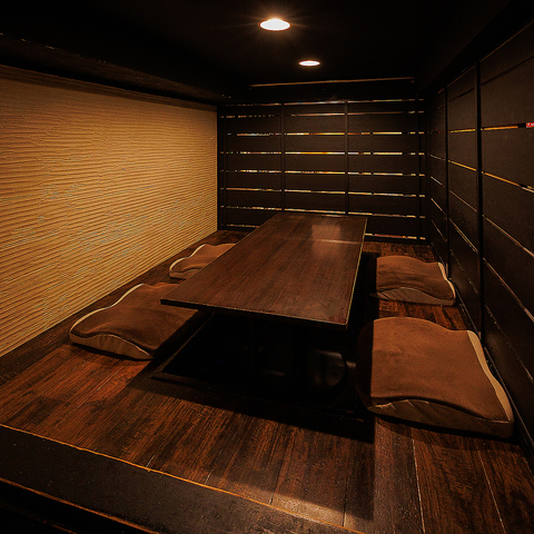 小上がりの掘りごたつ式のお席です。最大で6名様までご利用になれます。和モダンでおしゃれな空間で落ち着きのあるお席となっております。靴を脱いで心も身体もリラックスした状態で料理とお酒をお楽しみください。少しVIP感を味わいたいお客様におススメです。人気席の為、ご予約はお早めに!人気なお席絶品料理とお酒を◎