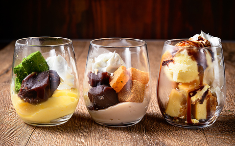抹茶わらび餅とプリン/きなこわらび餅とほうじ茶ブランマンジェ/チーズケーキ