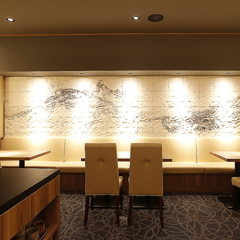 テーブル席のフロアは落ち着いた雰囲気でお食事をお楽しみ頂けます。壁に描かれた波の絵が高級感を引き立たせます。