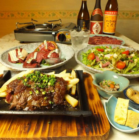 馬まんきつコースは2H飲み放題付きでとってもお得!とろける馬刺し盛合せの他馬肉のステーキなど充実の内容