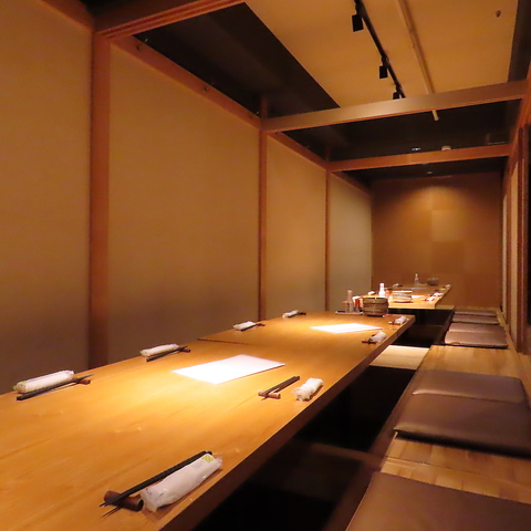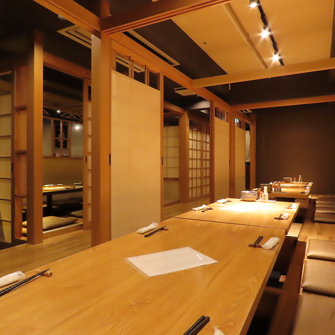 【1階:掘り炬燵式個室/テーブル個室】ふすまやのれんで仕切れば、少人数でのご利用もできます。白木の香る寛げる空間です。