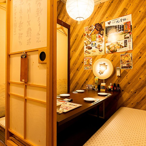 | 掘りごたつ個室 | 2名様×1 | 【2名席】 デートにピッタリな2名様席。雰囲気のある照明が趣を感じさせる上質な空間となっております。大切な方とのお料理とおしゃべりをお楽しみください。当店は個室で九州鶏料理を愉しめる居酒屋です。 |