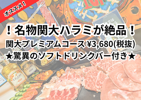 ジュジュアンで一番人気の食べ放題コース(ドリンクバー付)が4048円(税込)と破格のお値段!アルコールの飲み放題付きは5016円(税込)でご用意しております。名物の関大ハラミや壺漬けドラゴンカルビは絶品!!是非一度は食べてみて欲しいです!