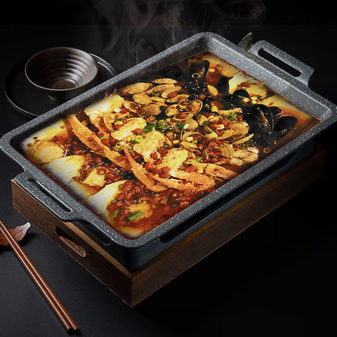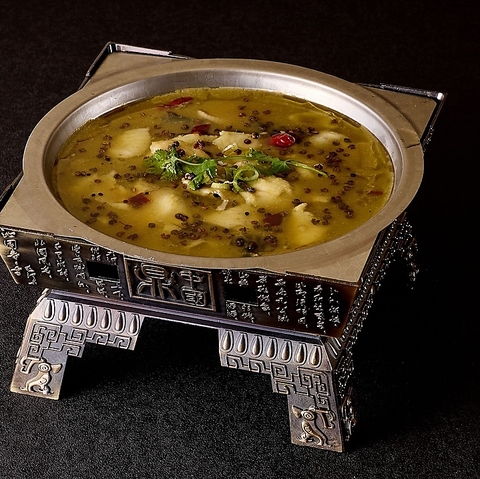 【名物!】 3~4人で火鍋のように楽しめる鍋料理、重慶焼魚!白身魚や野菜の旨味が詰まったスープは、ちょうど良い辛さと香ばしい香りが特徴です。辛いものが苦手な方でも楽しめる、やみつきになる美味しさ!みんなで囲んで、熱々をどうぞ。