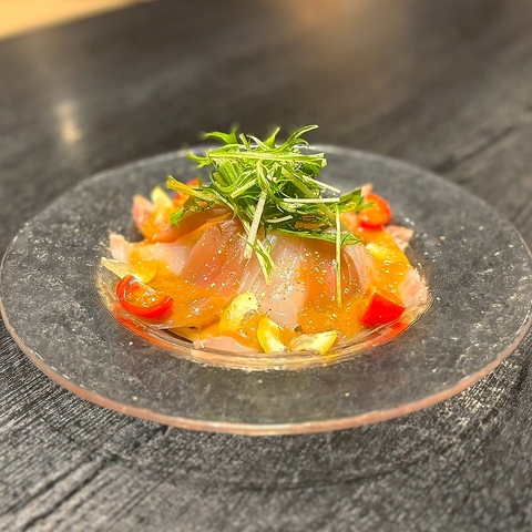 鮮魚を二種類使用し、特製ドレッシングで味付け。さっぱりしたおつまみが欲しいときに最適。