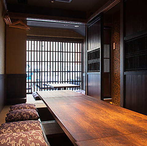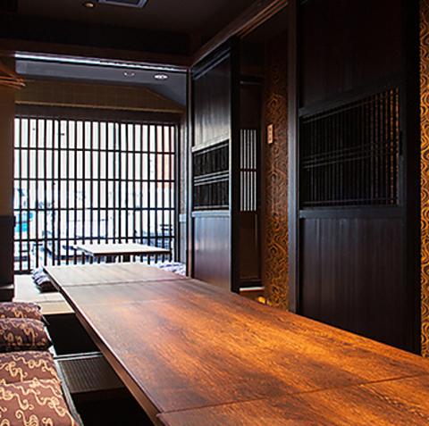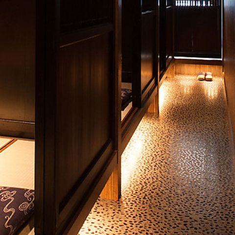 【京都の裏路地を彷彿とさせる趣のある空間】落ち着いた大人な「和」の空間は、どなたとでもシーンを選ばずご利用いただけます。京都の路地を彷彿とされる石畳や、隠れ家感のある個室、洗練された和のインテリア...趣あるこだわりの雰囲気も併せてお楽しみください。