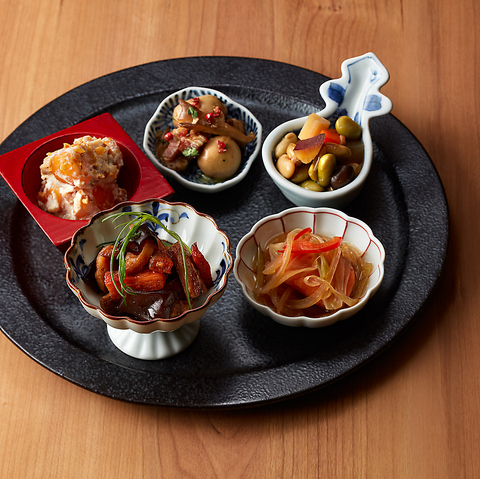 山形の旬が詰まった5種の小鉢「おばんざい盛り合わせ」。彩り豊かで目にも楽しい。日本酒と非常に合います